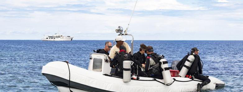 The Pelagians two custom-made 18ft rigid hull inflatable (RIB) dive tenders are equipped with double 50HP four-stroke (i.e. quiet) outboard engines, tank racks and secure stainless steel ladders. These tenders are comfortable and very easy to enter and exit. Diving is always conducted from the tenders as they allow us to transport divers directly to the dive sites more accurately than would be possible from the main ship.