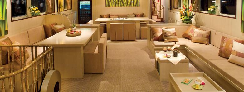 Offering a fresh and spa-like environment, the Superlux Cabin features a walk-around, queen-size bed and separate daybed. Bedside tables and large drawers under the bed offer guests ample space to store their belongings. Adjustable reading lights hang from the headboards for convenient night reading. The cabins have several portholes that allow for ample daylight to enter, and the bathroom features a glass shower area and a big vanity. The two Superlux cabins are located past the salon and down a flight of stairs.