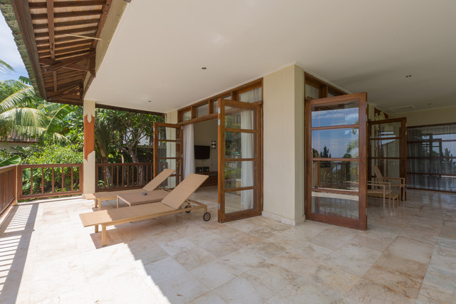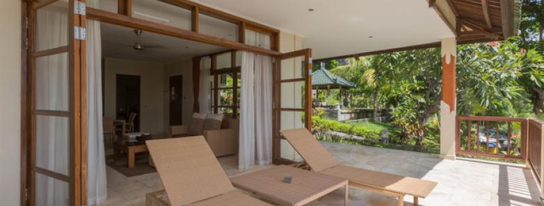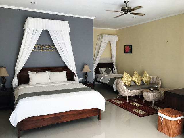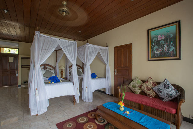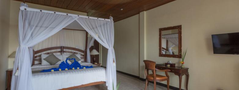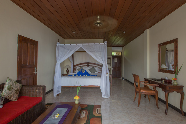 Spacious Balinese-decorated bungalow with double and single beds, sea-view balcony, AC, minibar, fan, safe, TV—ideal for three guests (extra bed available, includes breakfast).