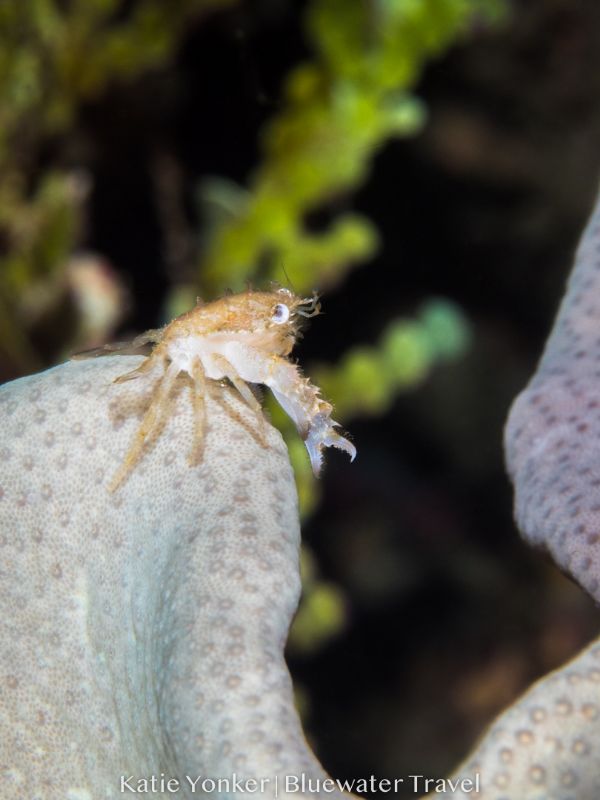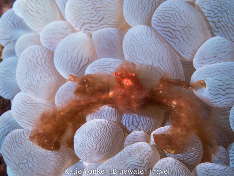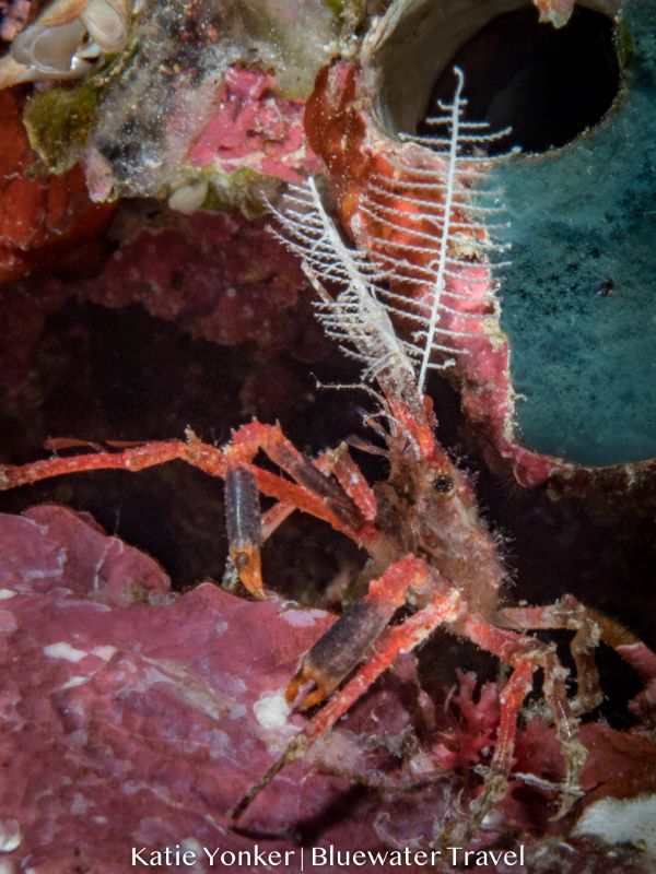 Between the four dive groups we saw multiple varieties of pipe fish (ornate, robust, and coral), octopuses (both reef and mimic), cuttlefish, nudibranchs of all colors, shapes, and sizes, seahorses, trigger, puffer, box, and reef fish, and rays. We also saw all sorts of shrimps and crabs, from small crinoid shrimp, a couple varieties of big mantis shrimp, tiny delicate crabs, dancing sexy shrimp, emperor shrimp riding a nudibranch, to an alien-looking corallimorph decorator crab camouflaged with clumps of living algae. The macro photographers on the trip were burning through memory card space on each dive.