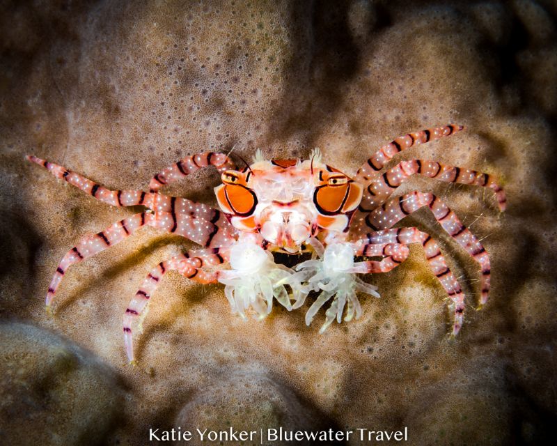 Underwater was just as spectacular. Hard and soft corals covered the steep sides of the islands and sea mounts. Pygmy seahorses in three different colors were found - the more common knobby Bargibenti purple and the much rarer yellow version, as well as the pale tan Denise species. We saw reef fish of all sizes, octopuses, an electric clam, nudibranchs, and at night, more octopus, complex marbled shrimp, a fuzzy red-orange orangutan crab, and an adorable boxer crab waving anemone poms poms.