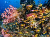 (Left) A thriving reef at Melissas garden. (Right) Untouched coral in the Fam Islands