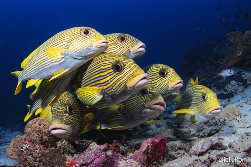 (Left & Center) Sweetlips photographed at Cape Kri by Eliel Alfon. (Right) A tasseled wobbegong by Andrew McCain.