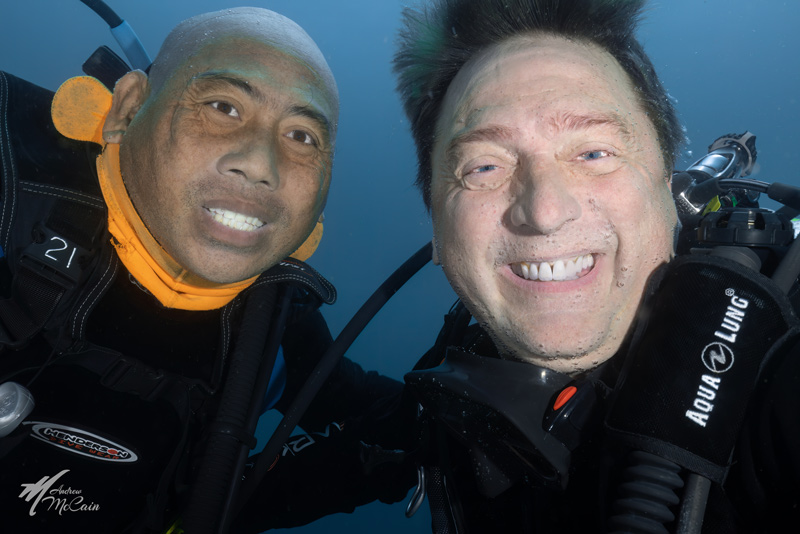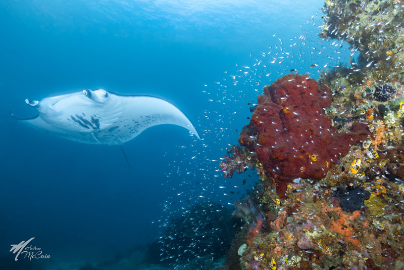 (Left)A tiny shaun the sheep photographed by Andrew McCain with a Canon EOS R5 camera, Canon RF100mm macro lens, and a Kraken +13 macro lens. This image won our friendly underwater photo contest!(Right)A manta near the cleaning station at Batanta.