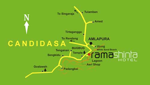 Rama Shinta Hotel is located in the center of Candidasa and on the lagoon side on the east coast of Bali approximately 85 km from Ngurah Rai International airport or about 90 minutes by car. Airport transfers can be arranged from or to the hotel at an extra charge.