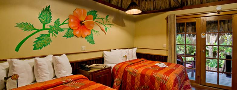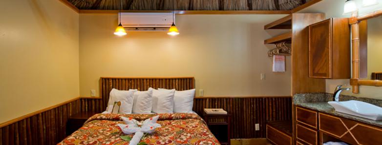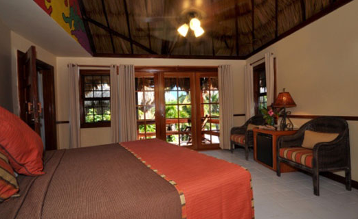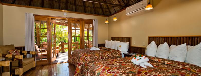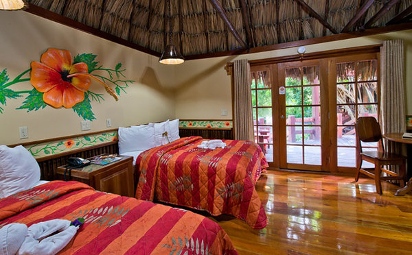 Jungle Standard cabanas offer a lush retreat with Belizean mahogany floors, Palmetto wainscoting, and a private bath. Features include a verandah, choice of two full-size beds (sleeps four) or one king bed (sleeps two).