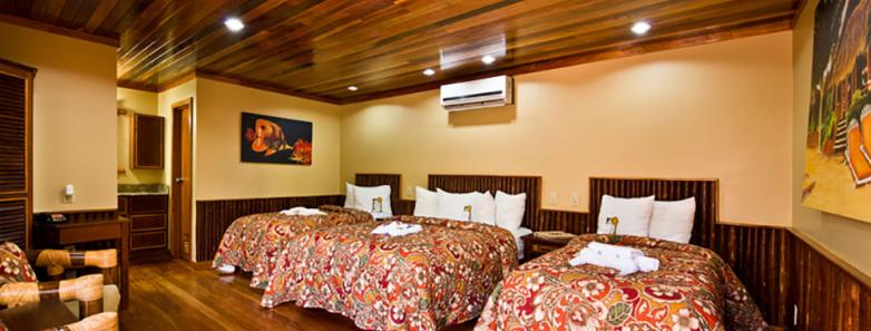 Jungle Deluxe units feature individual cabanas with either two queen beds or one king bed, or a first-floor unit with two queen beds. They include larger showers, granite vanities, and an in-room refreshment center.