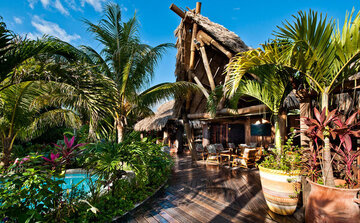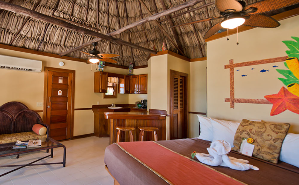 Each Polynesian-style Honeymoon cabana features a private bath, bar counter, sitting area, king bed, and French windows and doors opening onto a wrap-around verandah with a hammock and Caribbean Sea view.
