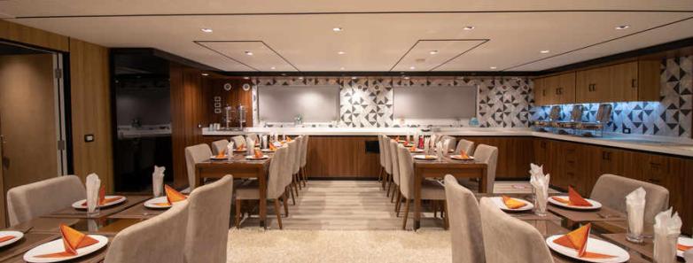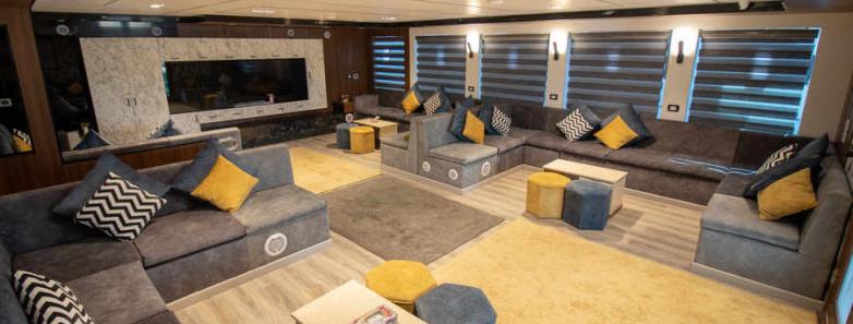 The Red Sea Aggressor IV can comfortably accommodate up to 26 passengers in its Master Staterooms (3) and Deluxe Staterooms (9.) Each stateroom features either a queen bed (for the Master Stateroom) or two twin beds (for the Deluxe Staterooms) and as well as air conditioning, a private head and shower, mirrored cabinet, hair dryer, fresh towels, and volume controls. Additionally, each room hasa 32-inch flat-screen TV offering a selection of 400 movies, TV shows, and documentaries.Guests can also make use of the TVs for editing underwater photos and videos by plugging their computers into the screen.