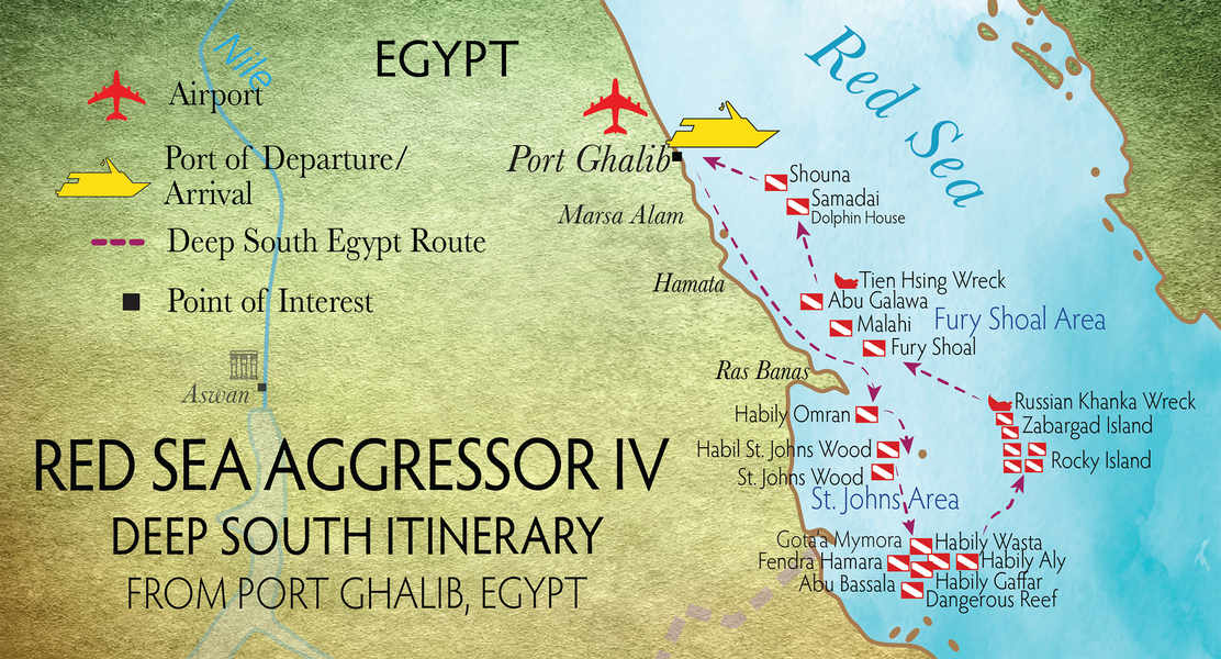 The Red Sea Aggressor IV operates from the Port Ghalib yacht marina and resort area.