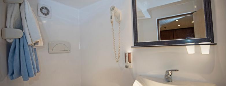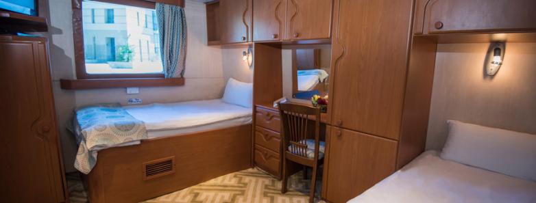 - 12' x 13', two single beds, porthole view, wardrobe, bathrobes, hairdryer, fresh towels, AC units, and private bathroom and shower.