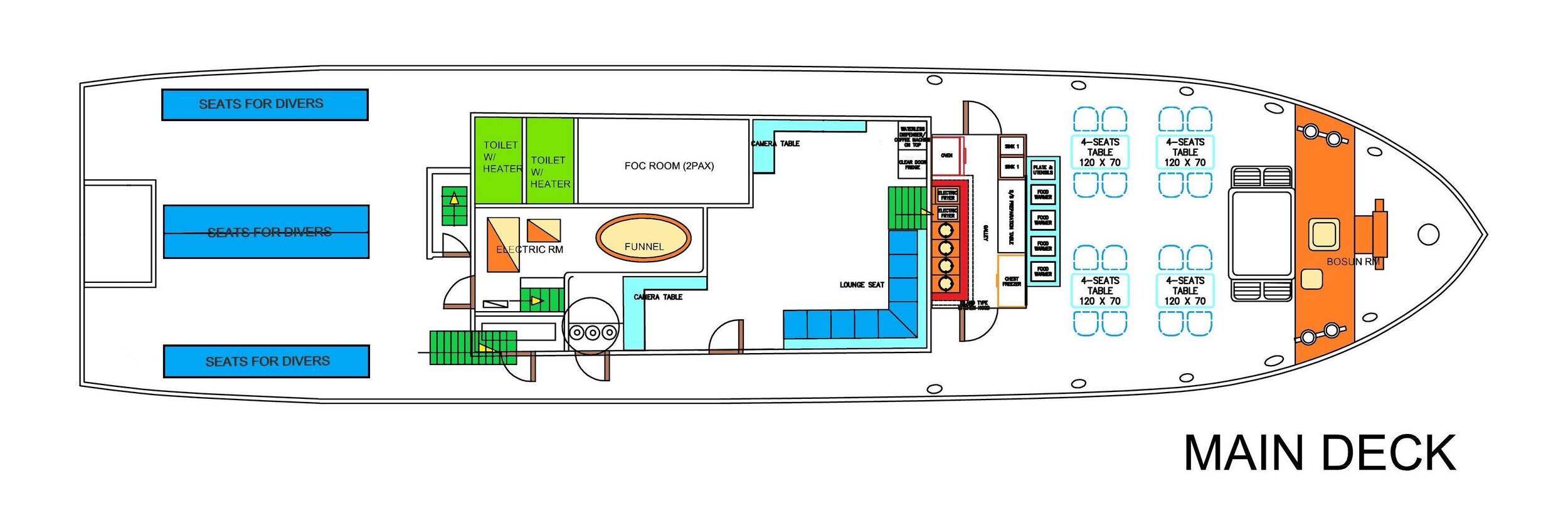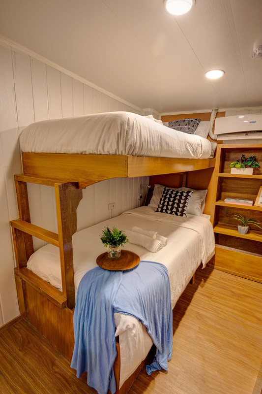 16 divers in 8 staterooms with ensuite bathrooms shared between 2 cabins. Each cabin with (remote-control) air conditioners.