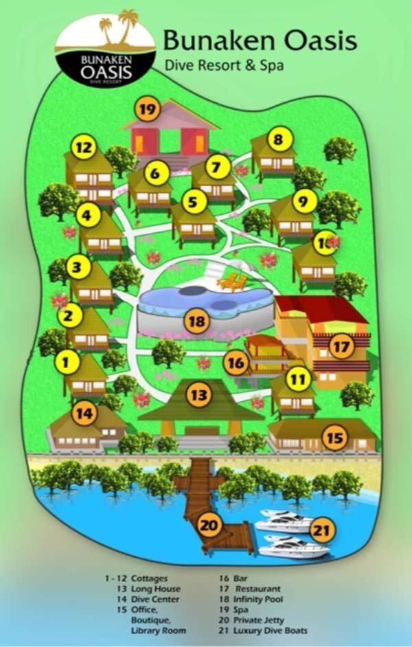 The Bunaken Oasis Dive Resort and Spa has ten 70 sqm luxury cottages, one 90 sqm double luxury cottage, and one two-story luxury cottage, with separate access, ideal for families with older children, or for friends traveling together.