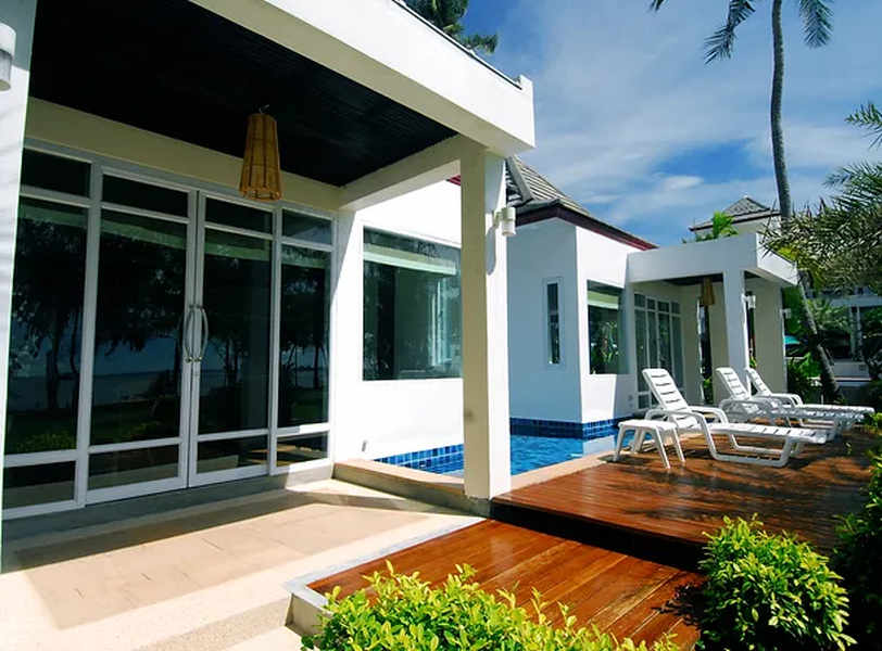 A roomy 95 m² beachfront villa with a bedroom and living area, featuring a private shared swimming pool