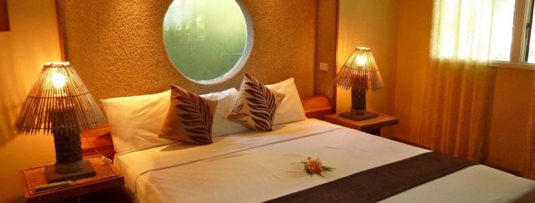 Cozy garden-view bungalows with tropical décor, peaceful surroundings, ideal for couples seeking serenity.