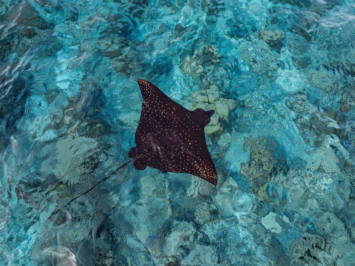 Because the resort sits near two main channels, there is a good chance to see bigger marine life as currents bring fish into the atoll.