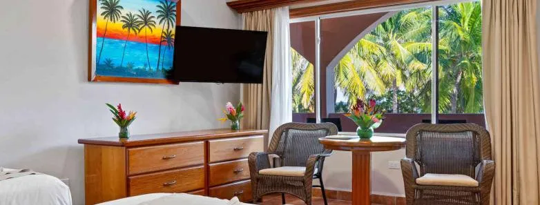 Indulge in spacious accommodations featuring tropical garden and pool views, ideal for families or friends with double and queen bed options available.