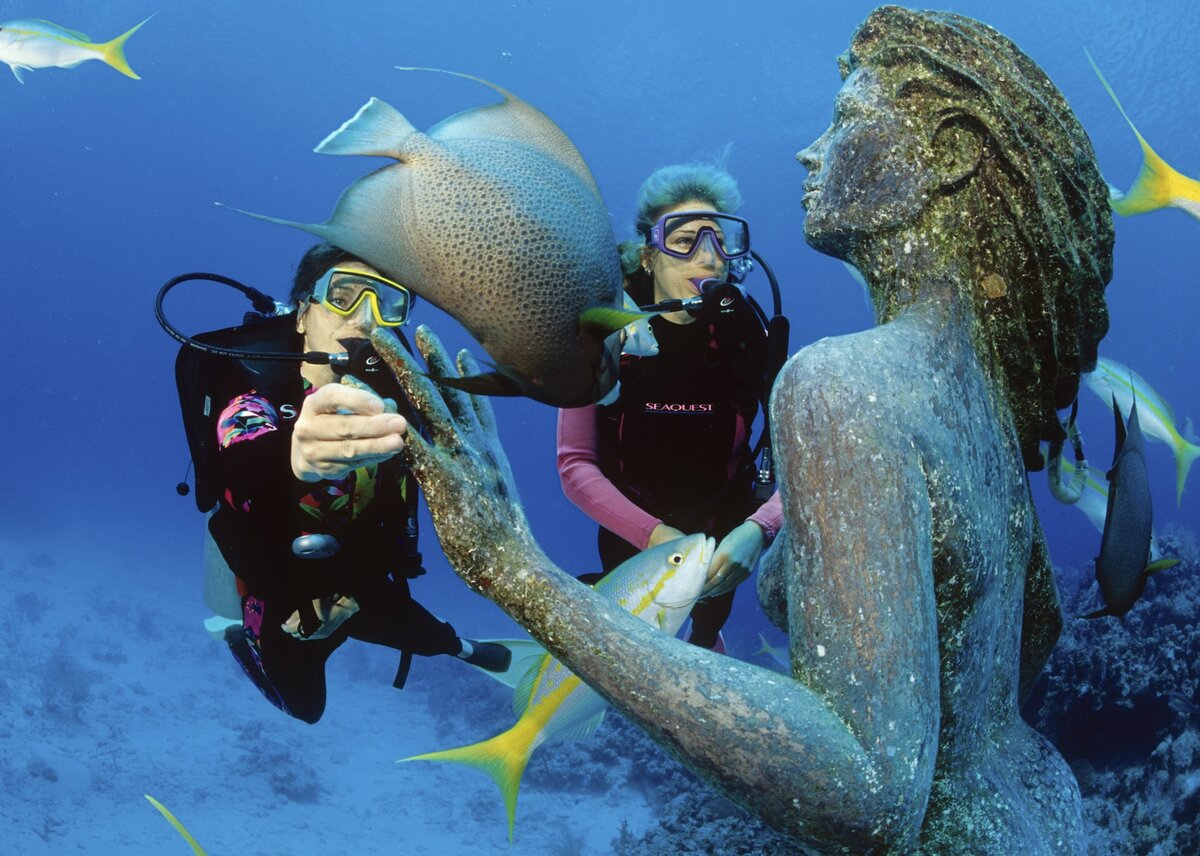 Once you're in the water you will immediately see why it is one of the best around. For starters the water is over 80 degrees all year long. You can giant stride into the ocean just 20 yards from the pool and bar. Here, in 12 feet of Caribbean water take your time and do a buoyancy checks, make sure everythings working and away you go. There are resident turtles, eels and on occasion manta and hammerhead sharks have been spotted. Remember their instructors will inform you of the sites major landmarks so you can enjoy the Wreck of the Nicholson, their coral nursery and Amphitrite, a 9-foot-tall bronze mermaid waiting to greet you. Watch out, you never know when the Atlantis Submarine will be taking visitors around Sunset Reef! Always a spectacular photo picture!