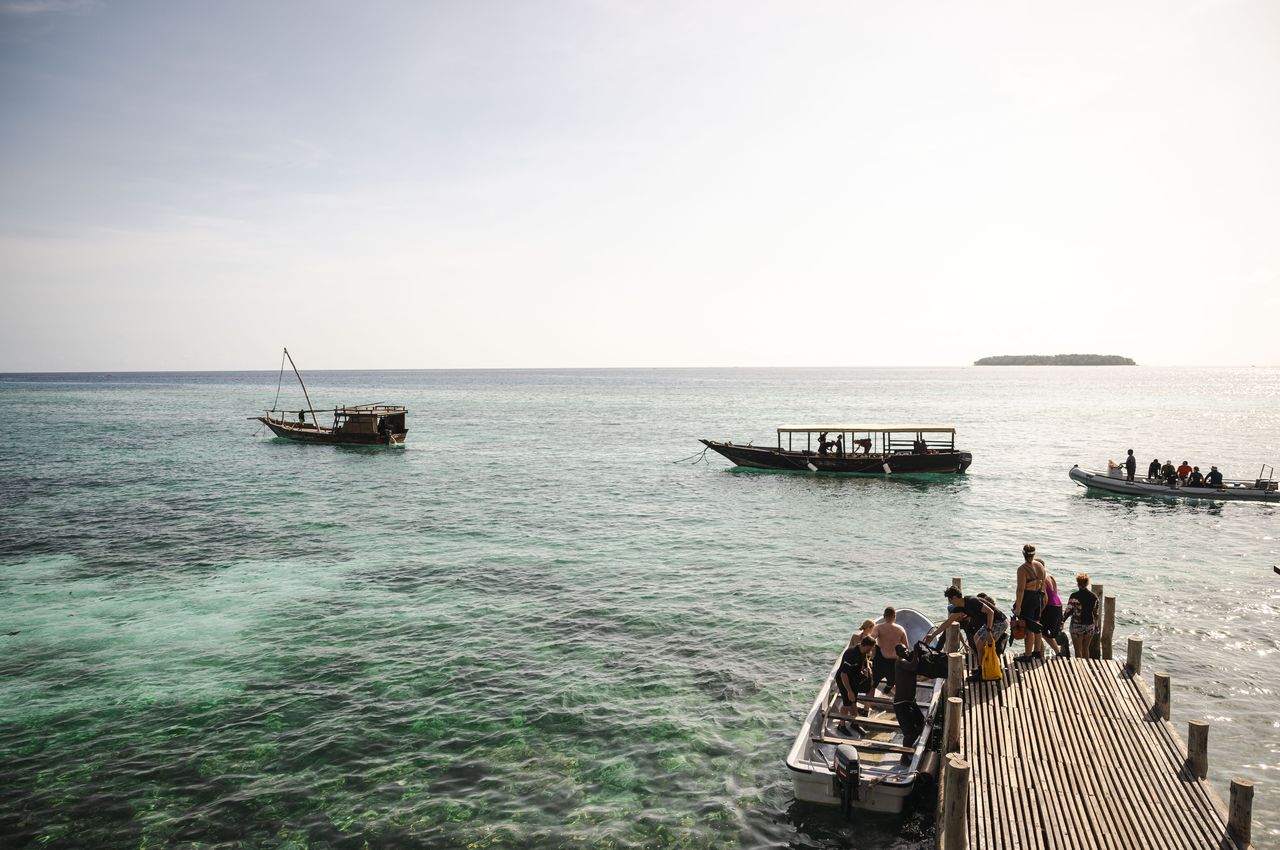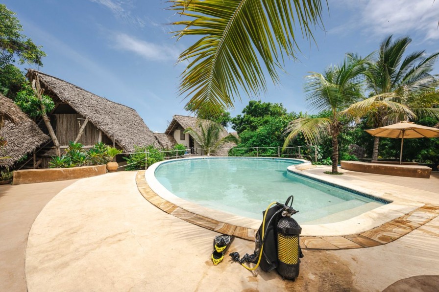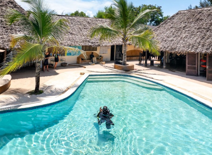 Staying at Sunshine Azure puts you in one of the best positions on the island for diving. The resort partners with Dive Point Zanzibar, a PADI 5 Star centre literally steps away, and their boats are out on the water every morning heading straight to Mnemba Island – just 25 minutes offshore and widely considered the finest dive area in Tanzania. Visibility here regularly exceeds 20 meters,, and the sites range from gentle coral slopes perfect for first-timers to dramatic walls that drop well past 30 meters for the more experienced. Between dives, the surface interval is spent on the boat with tea, fruit, and cake, while you drift in turquoise water