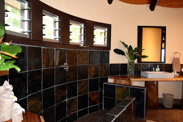 Taveuni Dive Resort's 8 bures are far more comfortable than traditional bures. Each spacious room includes a lounge area that includes a small refrigerator, a lounge/couch that converts to a bed, side table, and chairs that most guests move back and forth between the patio and the interior of the bure. In the middle of the bure is the sleeping area, with a king size bed and benches along the wall to store your gear or baggage. At the rear of the bure are the shower, twin sinks, and water closet. Each bure can comfortably hold two people, with a third person or children sleeping in the lounge area. They can adjust the bedding to accommodate different sleeping arrangements.The large rooms have louvered windows and high ceilings with ceiling fans, providing natural ventilation to keep the rooms cool without the need for air-conditioning, and solar hot water heaters equipped with backup electrical elements provide hot water.