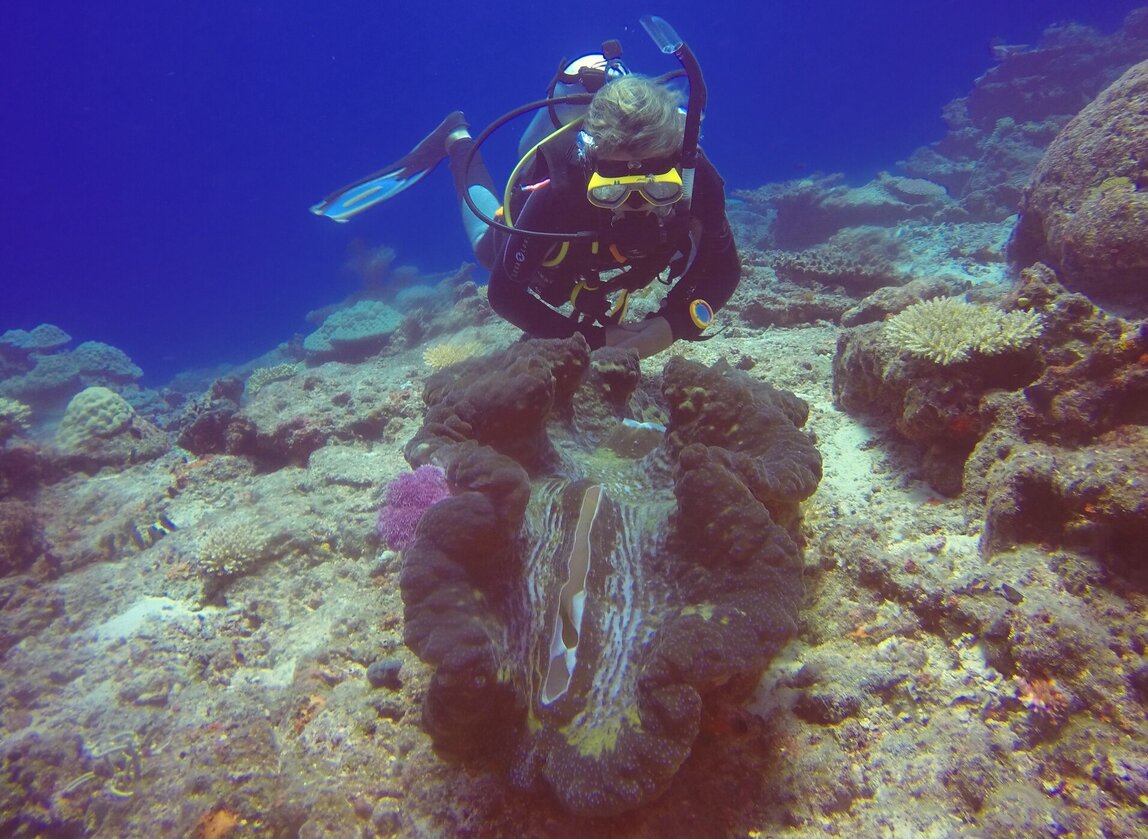 In 2000, they set up the Tokoriki Giant Clam Regeneration Program in partnership with the Fiji Ministry of Fisheries. Through trial and perseverance, they have ended up with the largest collection of mature Tridacna gigas clams in Fiji! This is a critically endangered species of giant clam, with their largest weighing approximately 100 kg/ 220 lb, and measuring over 1 metre/ 3 ft in length.