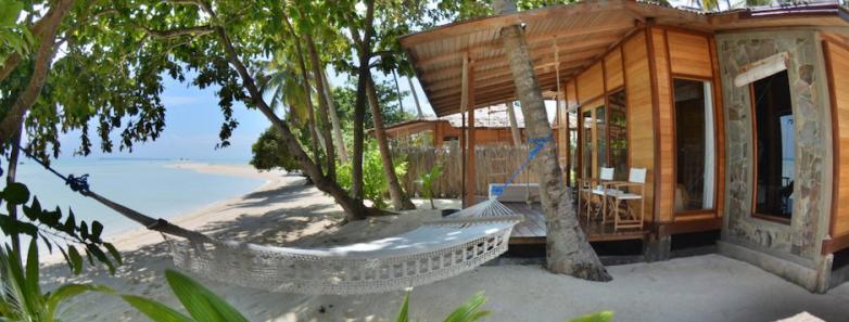 Enjoy the Superior Bungalow's 70m² of sustainable living space, complete with premium amenities, a terrace lounge, hammocks, coffee machine, WiFi, and stunning views of Nunukan Island.