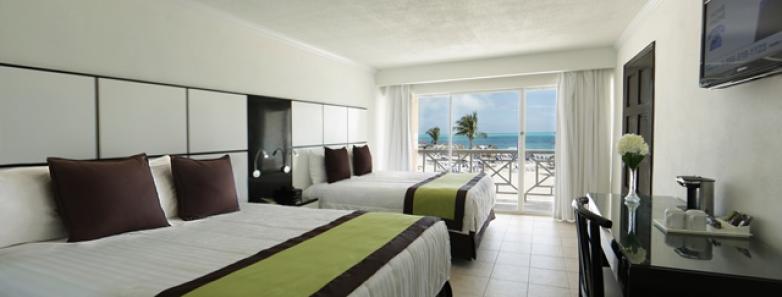 Unwind in our tropical-inspired rooms, featuring queen-sized beds, a private balcony, air conditioning, and a mini-fridge for your comfort. Perfect for families!