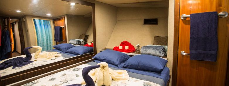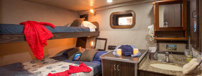 - With two sets of twin bunk-style beds staterooms the deluxe have a double bottom bed and single top bunk bed and #2 & #3 has two twin bunk style beds each with a private head and shower, port hole, individual climate control, monitor with media player, USB/110v outlet and hair dryer.