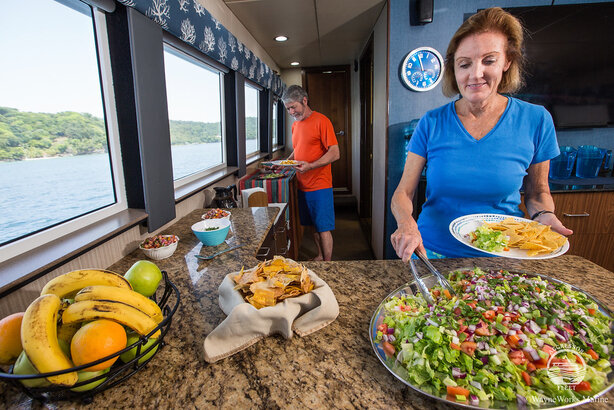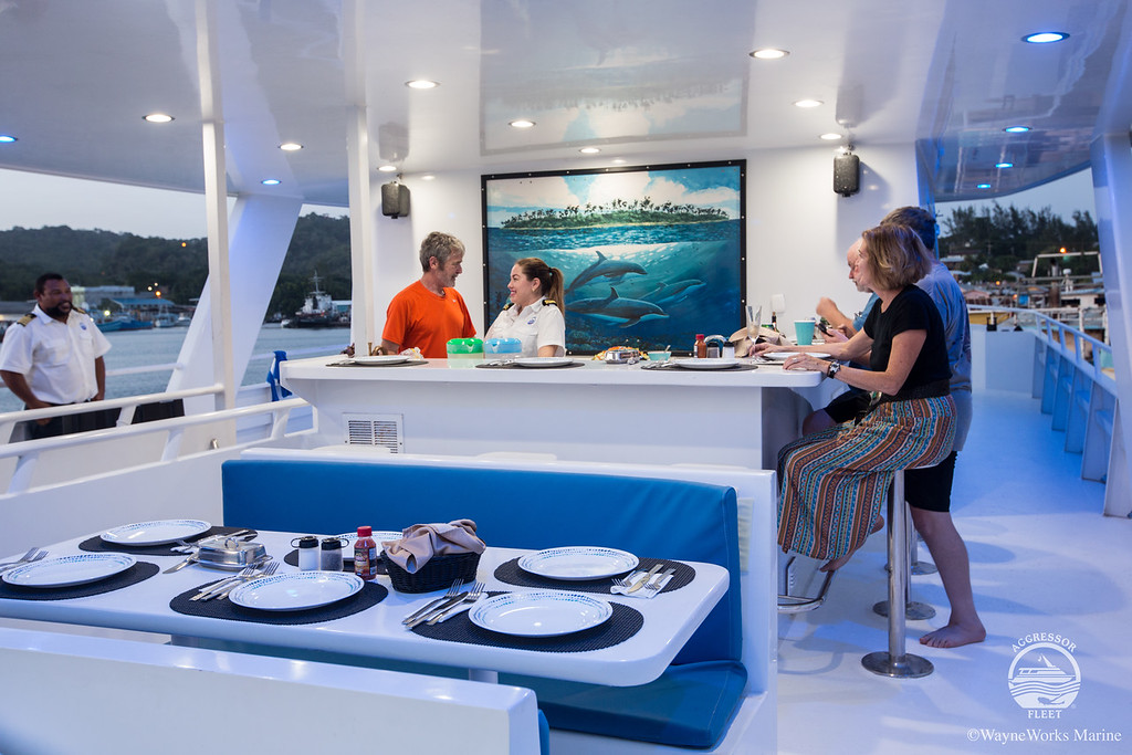 The menu onboard is varied and plentiful, with fresh local fruits and veggies, island seafood, and locally grown meats serving Caribbean and American feasts, barbecues and local cuisine. The Roatan Aggressors selection includes fruit juices, soft drinks, iced water, iced tea, coffee, and a limited selection of local beer and wine, which are complimentary.