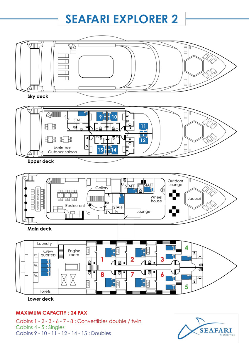 Seafari Explorer II offers guests a wide range of original programs and high-quality itineraries to the North, South and Central Atolls. Accessible to everyone, Seafari focuses on security, discovery and entertainment.