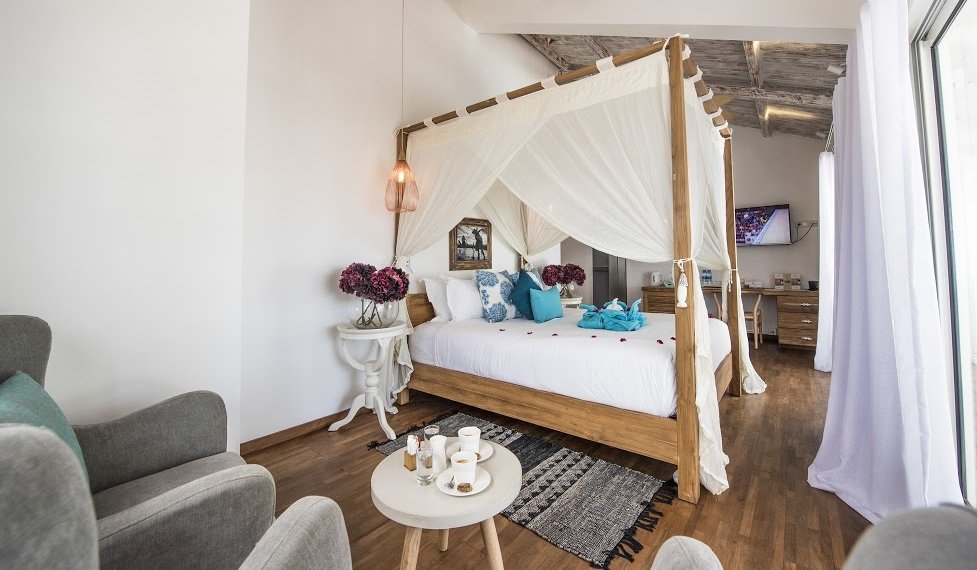 Discover luxury in our Deluxe Rooms featuring elegant decor, satellite TV, marble floors, and a private terrace with breathtaking ocean vistas.