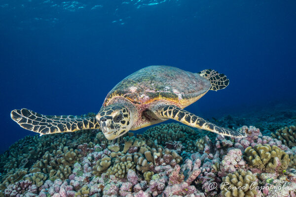 A hawksbill turtle soars over Tiputa Pass