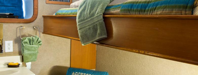 Accommodations include six Deluxe Staterooms, each having a double and single berth with ensuite bath and flat-screen TV and DVD player, two Single-Share staterooms each with two single berths that share a bathroom/head between the two staterooms with flat screen TV & DVD player and one master suite for couples that have one large double bed with ensuite bath and a flat-screen TV and DVD player.