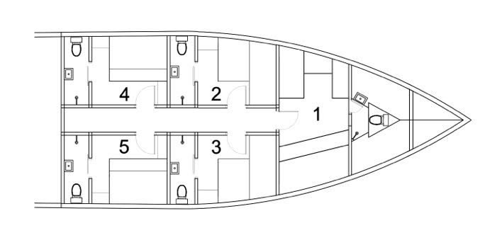 With 6 double cabins, all with 90 cm extra bunk, AC and en-suite, she can comfortably home a maximum of 12 guests.