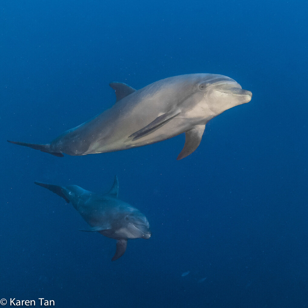 After a couple of hours on the lookout, we had another long interaction with a different mom and baby from the previous day.The mom stayed a bit deeper with the baby swimming between the surface and the comfort of mom 40 below. The mom would periodically come up and lift her calf to the surface making sure to have access to life-preserving air.