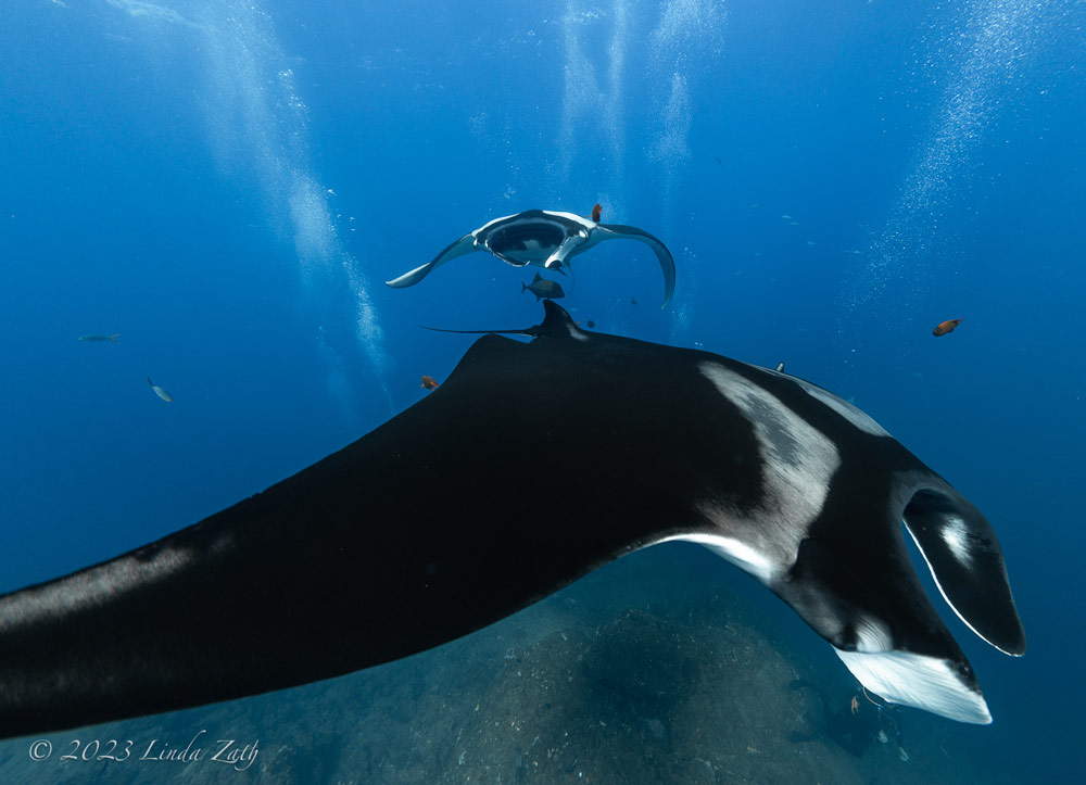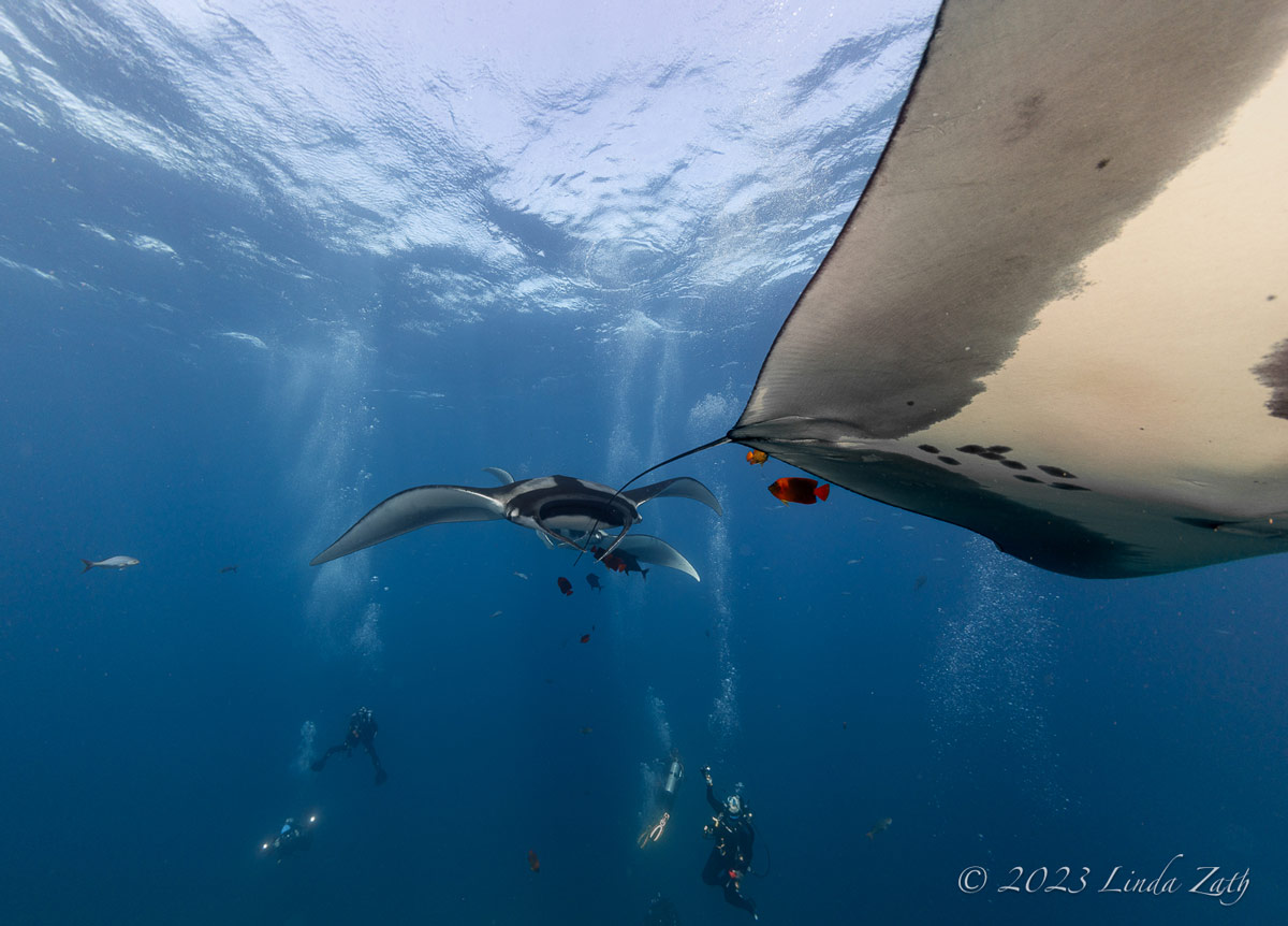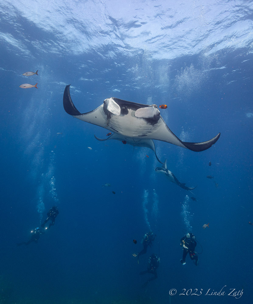 Our fifth day was spent at Wakaya, where we alternated between sites known as Blue Ridge and Lions Den. The main attraction here is the possibility of mantas, as they often show up to rid themselves of parasites, courtesy of the resident cleaner wrasses. Despite both of our groups waiting patiently, however, by the end of the second dive, no mantas had shown up. We did see a lot of other great stuff though, including 3 yellow leaf scorpionfish, a giant moray, squarespot and purple queen anthias, several pairs of decorated dartfish, a school of roughly 30 coronetfish, and a clown triggerfish being shadowed by an orange-spotted trevally. And, a few lucky divers got a glimpse of several scalloped hammerheads and even a lone great hammerhead! Topping it off, that afternoon, just as it looked like the winged giants would be a no-show, two nearly all-black mantas showed up and made a number of close passes over about 30 minutes while being serviced by resident cleaner wrasses. Those who did the night dive reported a good variety of reef creatures and mid-water swimmers, along with a rare sighting of a pearlfish outside of its sea-cucumber home.