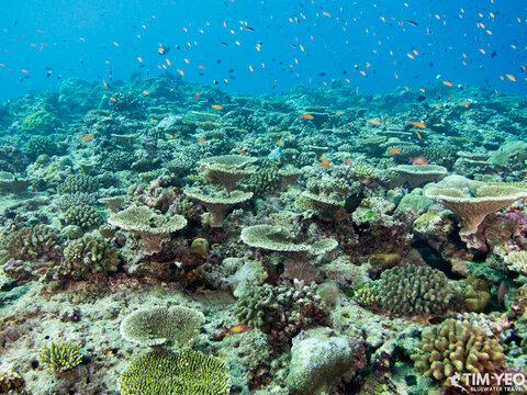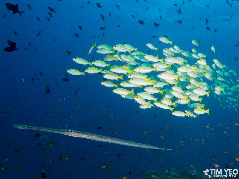 After breakfast, we dove again. We mainly just hooked into the reef and watched the field of fish flowers (yellow blue striped snappers) swirl around us. We also saw blue triggerfish and oriental sweet lips.
