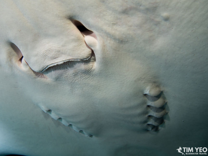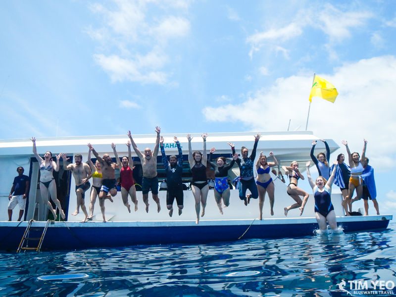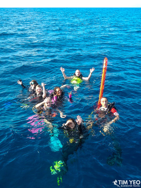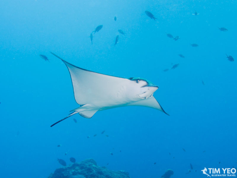 Between Dive #4 and Dive #5, we took a snorkeling break to find reef mantas. In the process, we saw 3-4 mantas circling a nearby pinnacle. We swam out into the ocean after them. The crew on the boat kept pointing them out to us as they swooped around us.