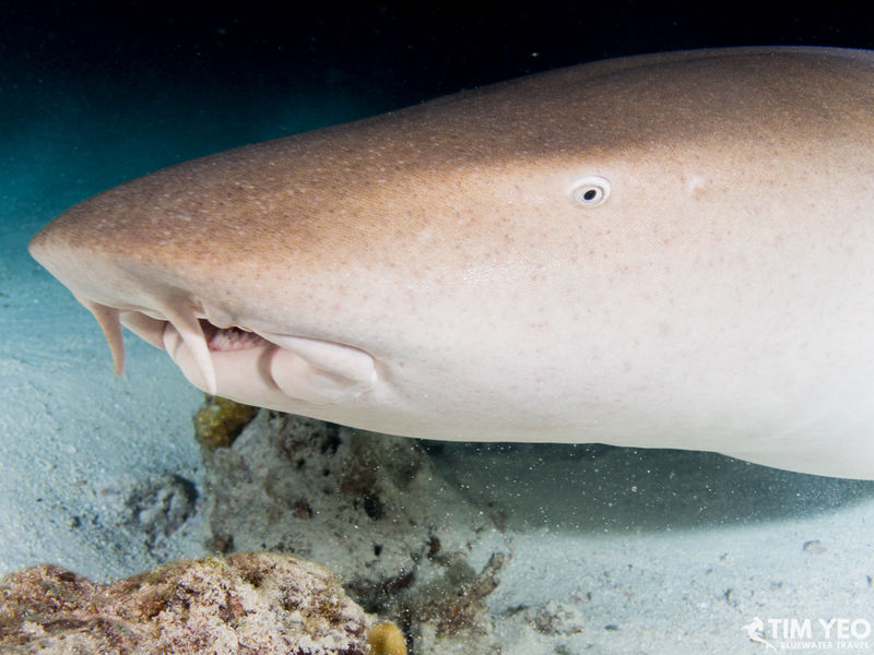 We ended the day with a bang. A night shark dive near a pier! This dive let us get up close and personal with innumerable nurse sharks and quite a few stingrayswho were all coming in for a feeding frenzy as we kneeled down in the sand to watch. We also spotted some bluefin jacks and lionfish. Unfortunately, we surfaced to stormy conditions of big waves and rain in the harbor. When we got back to the Duke of York, the dhoni couldnt dock due to the conditions, so we jumped into the water with mask and fins, grabbed a tether line, and swam to the liveaboard. It was a fun adrenaline-inducing adventure!