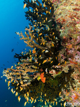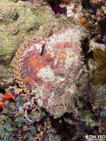 Unfortunately, the reef on this dive did not look very healthy. It looked as if it were covered in snow, but the snow was sand. However, we still viewed a plethora of sea life, including scorpionfish, lionfish, blue triggerfish, basslets, mantis shrimp, a few moray eels, Blue-fin jack, Oriental sweet lips, and orange and purple anthias.