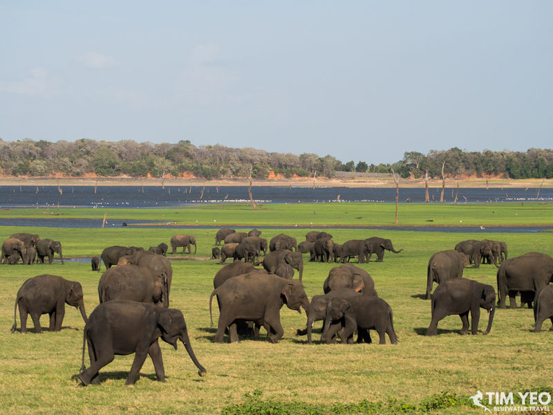 We then returned to Cinnamon Lodge to hang out by the pool and enjoy a brief break before boarding jeeps (4 people to a jeep) to Kaudulla National Park. Historically, Kaudulla was one of the 16 irrigation tanks built by King Mahasen (227-304 A.D.). Following a period of abandonment, it was reconstructed in 1959, and now supports a variety of plant and animal life. On our visit we spotted at least a hundred Asian elephants, as well as other birds such as eagles, storks, and peacocks.