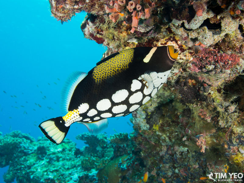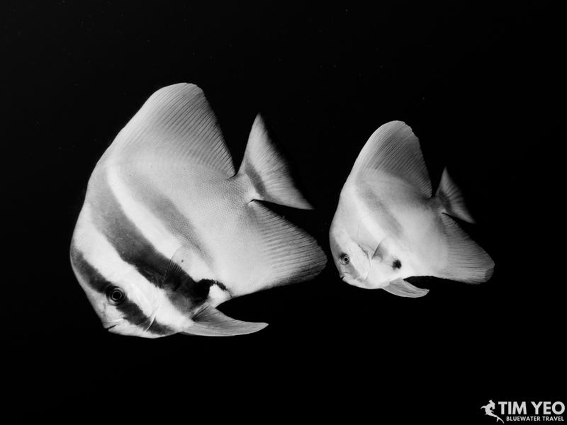 We descended through batfish (always a good way to start a dive), and saw a Napoleon wrasse sleeping in a cave, a swimming hawksbill turtle, blue triggerfish, bluefin jack, an eagle ray, a crawling baby mantis shrimp, a large school of batfish, a large school fusiliers, and dogtooth tuna.