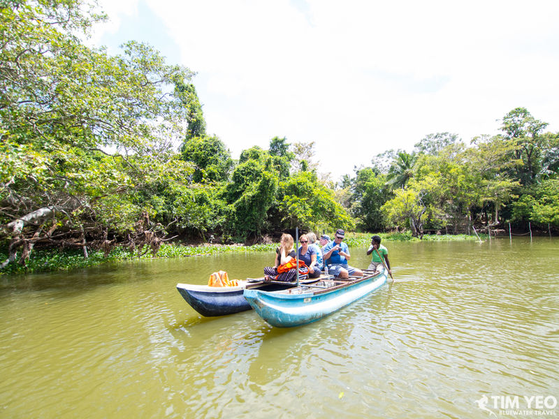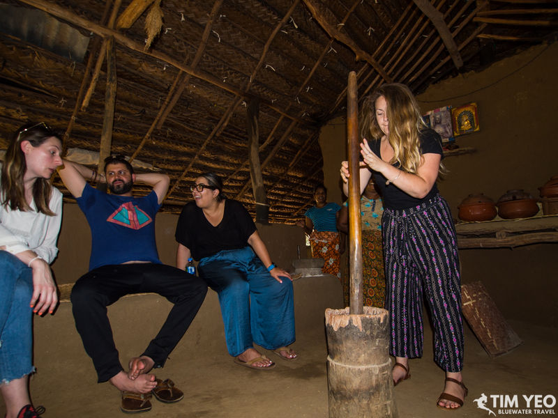 After the cave temples, the bus then drove us to a traditional Sri Lankan village. We all boarded bullock carts pulled by 2 oxen each for a short ride. Upon alighting the bullock carts, we walked along a scenic trail past crop fields and an ancient reservoir to a peaceful village where we learned about the daily lives of the local people. A few women taught us how to make dahl curry, unhusk rice, and weave pleats from leaves to make a roof. The women also provided a delicious buffet lunch in a large, open-air hut in the villagebefore the villagers ferried us back across the river to tuks tuks and to our bus.