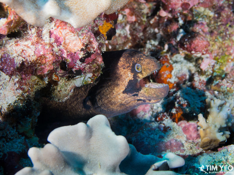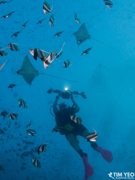 On this dive, we saw a large manta ray, spotted eagle ray, honeycomb moray eel, and black-tip reef shark.