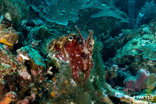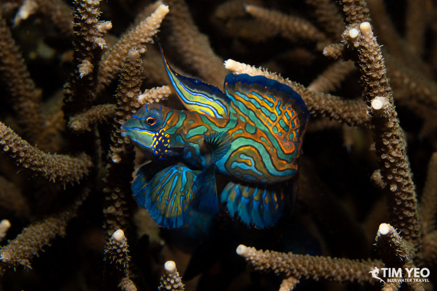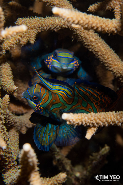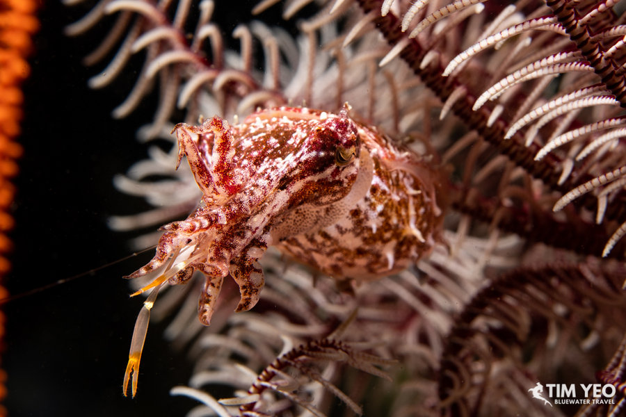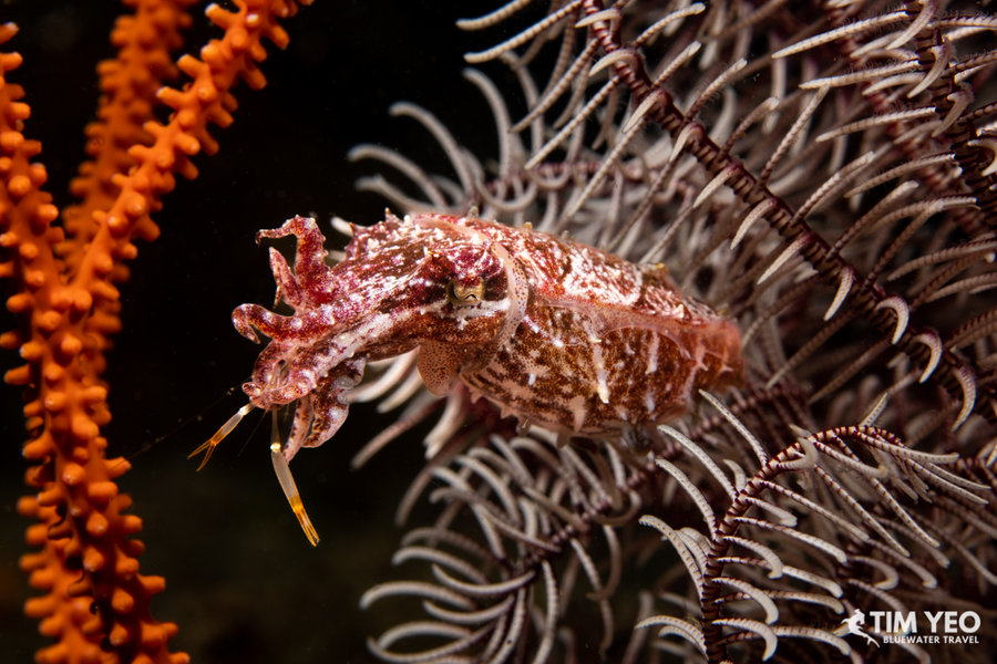 We did three day dives and one night dive in Lembeh Straits to start the trip. Lembeh Straits lived up to its reputation and we saw pygmy seahorse, mimic octopus, blue ring octopus, hairy frogfish, flamboyant cuttlefish, pygmy squid, pygmy cuttlefish, and many different species of nudibranchs. There were also pretty reefs with beautiful fishes like the endemic Banggai cardinalfish and the colorful and interactive mandarinfish. A massive reef cuttlefish spent a good amount of time showing us its ability to change shape and color.