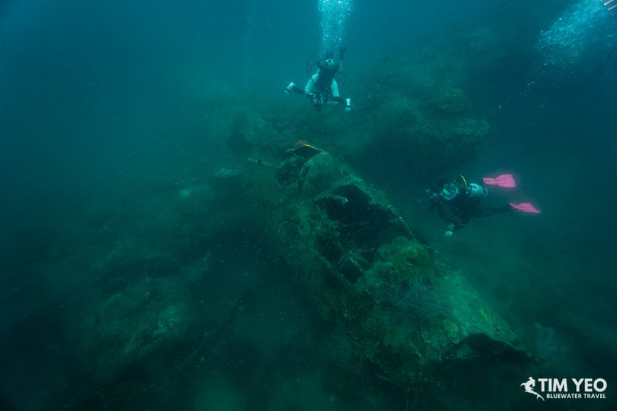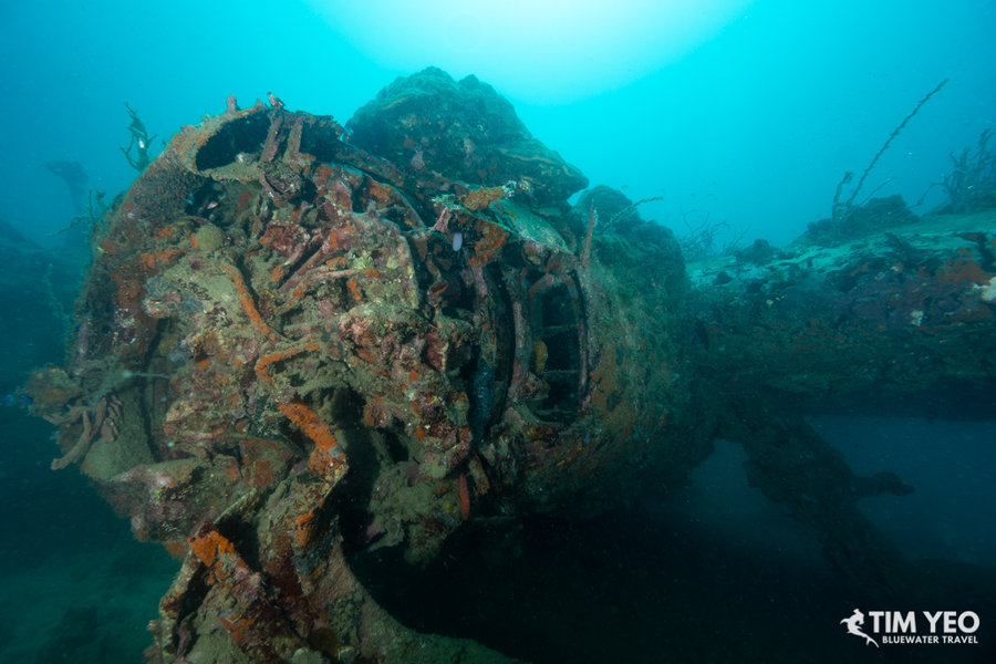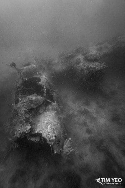 This morning we dived a WWII American bomber B24 Liberator plane. She took off for a reconnaissance trip on May 3, 1945, and crashed in 60 feet of water in a calm bay after an engine fire. The plane is 55 feet long and has a wingspan of 70 feet. All 11 crew members survived the crash. Today she sits upright with one propellor still intact, one of her landing gears down, and the two machine guns behind the cockpit and the one machine gun at the back of the plane still in good condition.