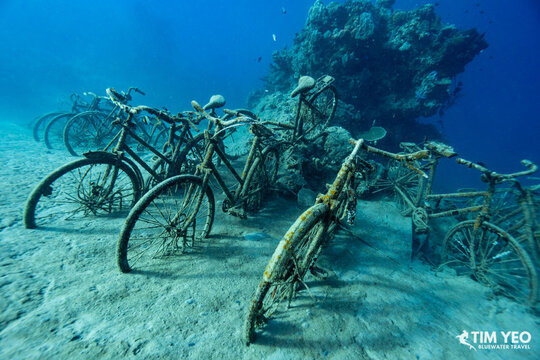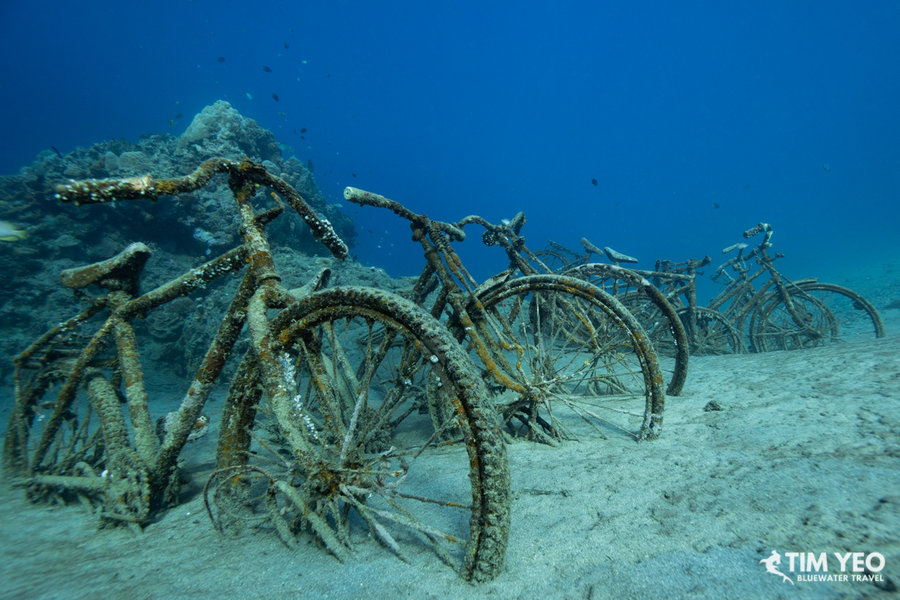 Barely 50 yards from shore, we jumped into the water and there were two whale sharks with us. They took turns coming to the fishermen to investigate while the other whale shark took off into the deep. Some of us opted to dive with them while others chose to snorkel, and some did both! With no other snorkelers or divers around, we could spend as much time as we wanted with the two whale sharks and everyone had some awesome close interactions with the largest fish in the world. Below the whale sharks, there was also a bicycle graveyard in 20 feet of water.