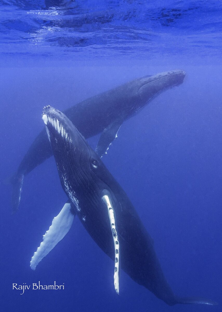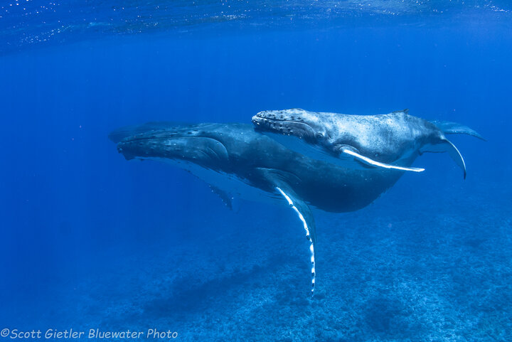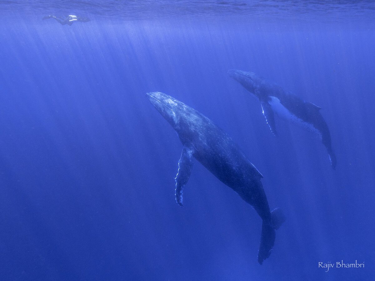 In one memorable encounter, there were 4 whales in total a mom, calf, and two escorts. A 5th whale even showed up for a brief moment. The fact that this was over a shallow reef in crystal clear water added even more to the encounter.