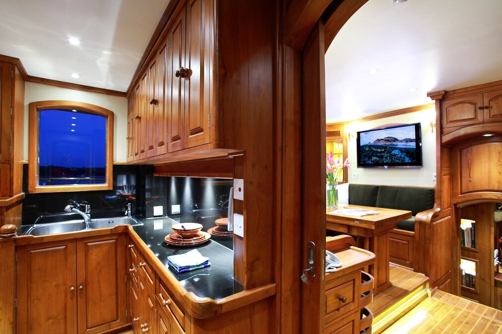 230 Volt / 50 Hz from European style outlets. Plug adapters are available onboard.