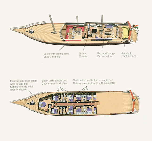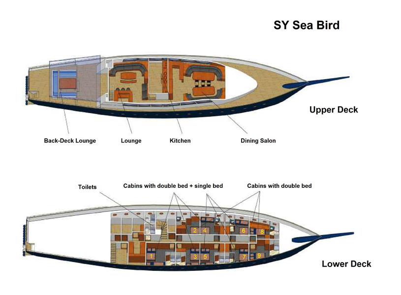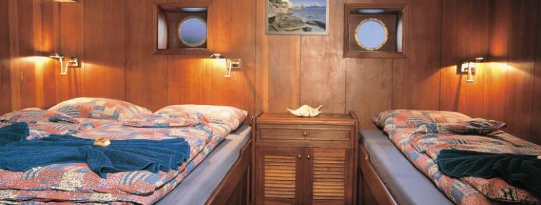 The Sea Star and Sea Bird offer 9 guest cabins each. The cabins are between 9-11 square meters and are fully air-conditioned. Each cabin also comes complete with an ensuite bathroom, as well as reading lights, power connections, and storage. Cabins are cleaned by the crew daily.